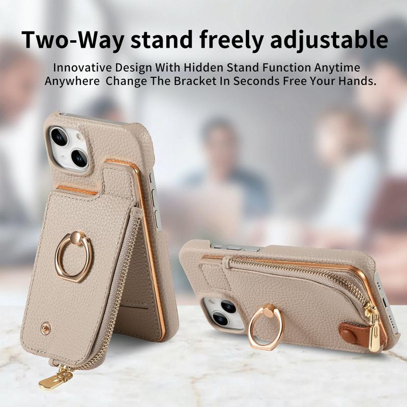 Θήκη iPhone 14 Δερμάτινη Litchi με Δαχτυλίδι & Φερμουάρ Πορτοφολιού (Χακί)
