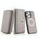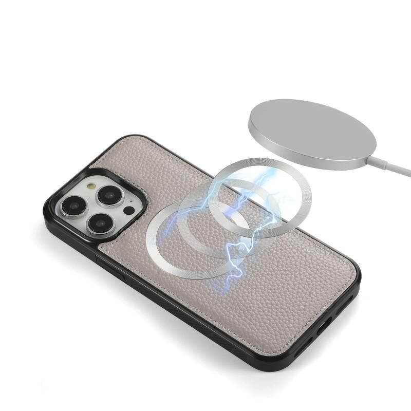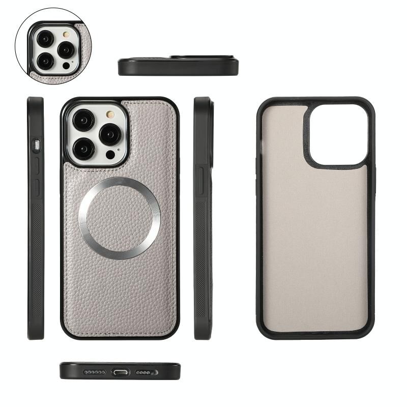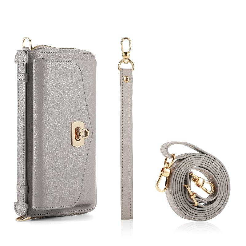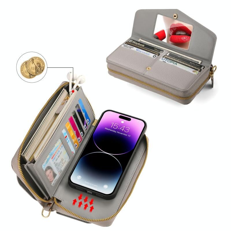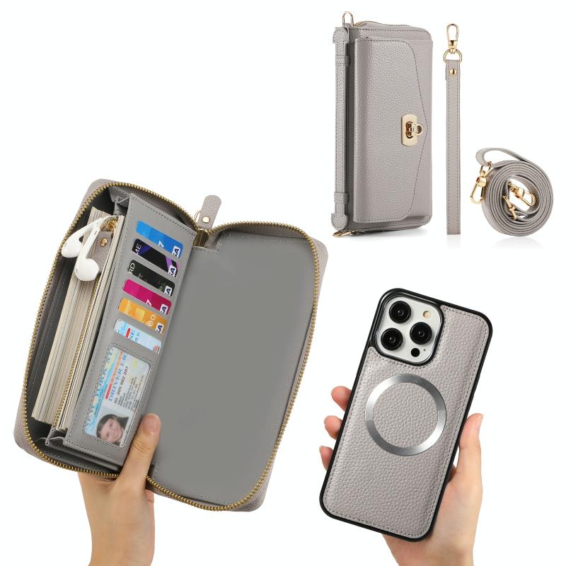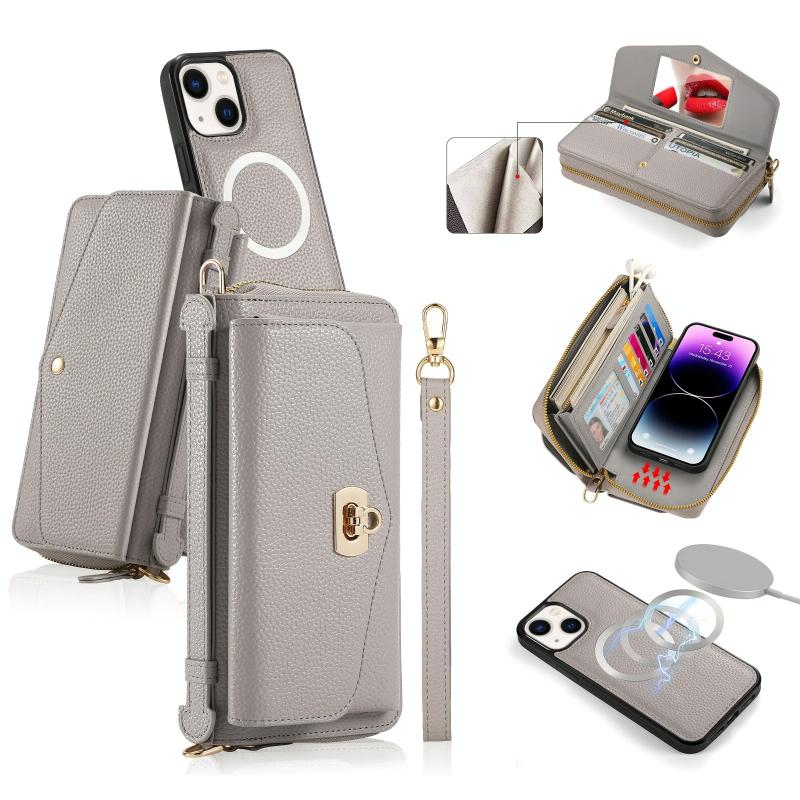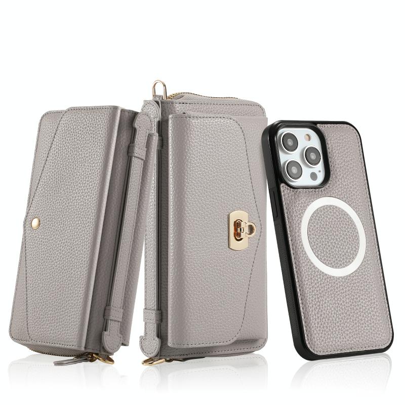 Θήκη iPhone 14 MagSafe Crossbody με Πορτοφόλι από Δέρμα Litchi (Γκρι)