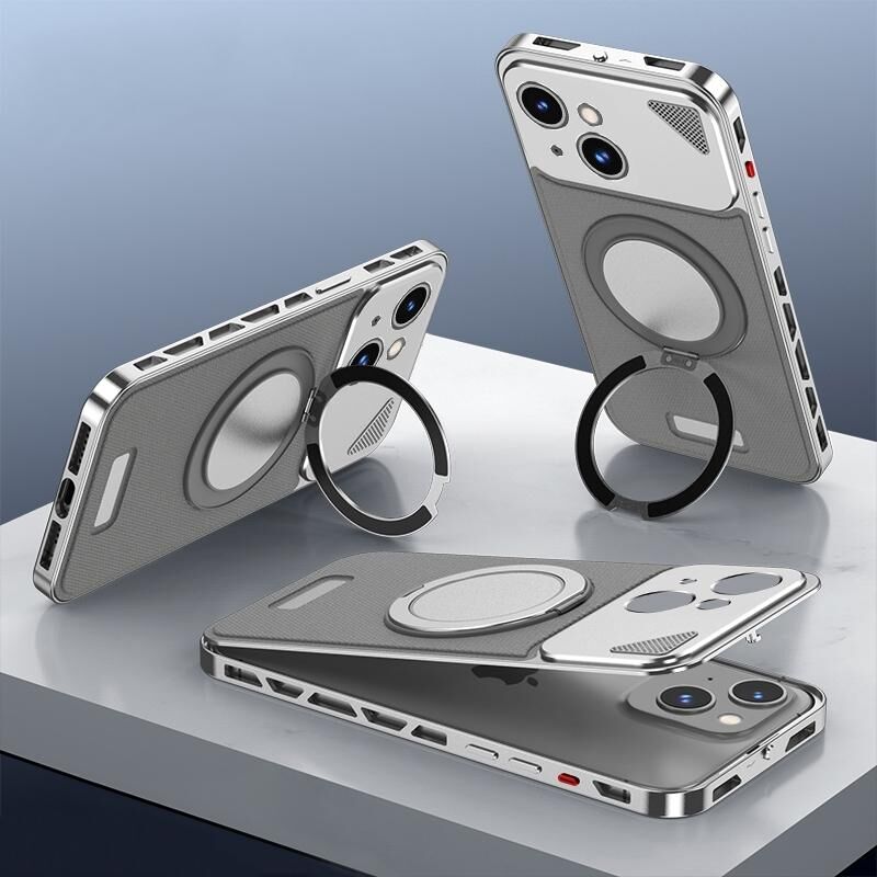 For iPhone 14 Metal Snap Buckle 360 Degree Rotating MagSafe Magnetic Holder Phone Case(Dark Grey Silver)