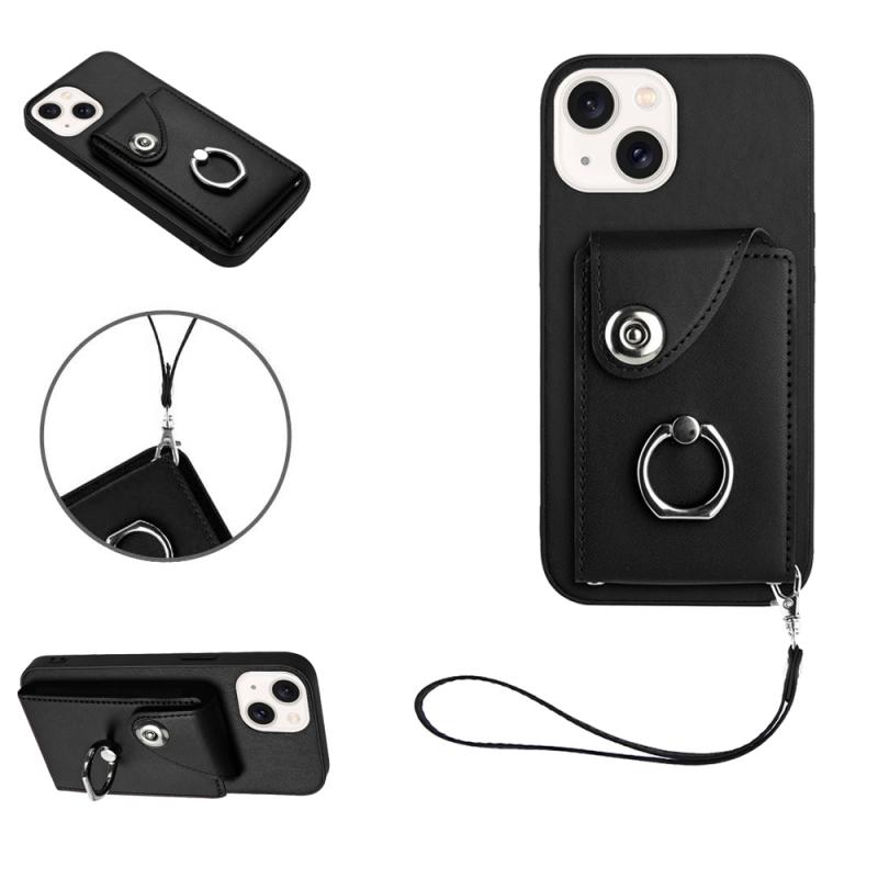 For iPhone 14 Organ Card Bag Ring Holder PU Phone Case with Lanyard(Black)