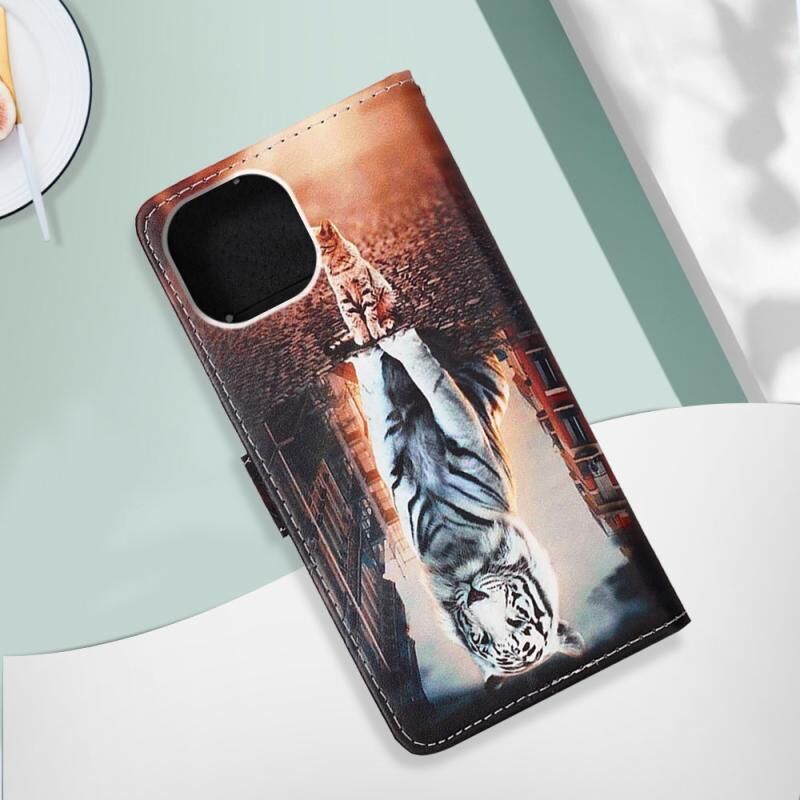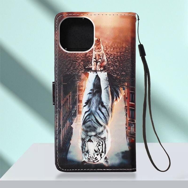 Θήκη για iPhone 14 από Δέρμα με Επίπεδη Υφή και Σχέδιο (Γάτα και Τίγρης) με Λουρί, Θήκη Κάρτας και Πορτοφόλι.