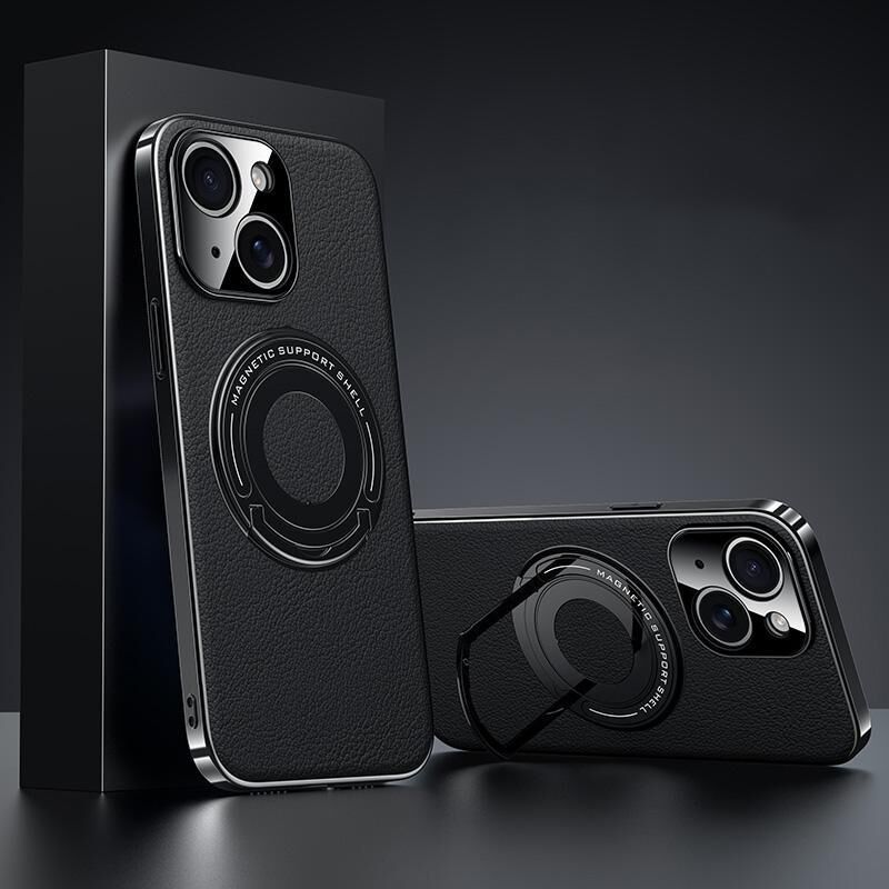For iPhone 14 Plain Leather Hydric Metal Holder MagSafe Phone Case(Black)