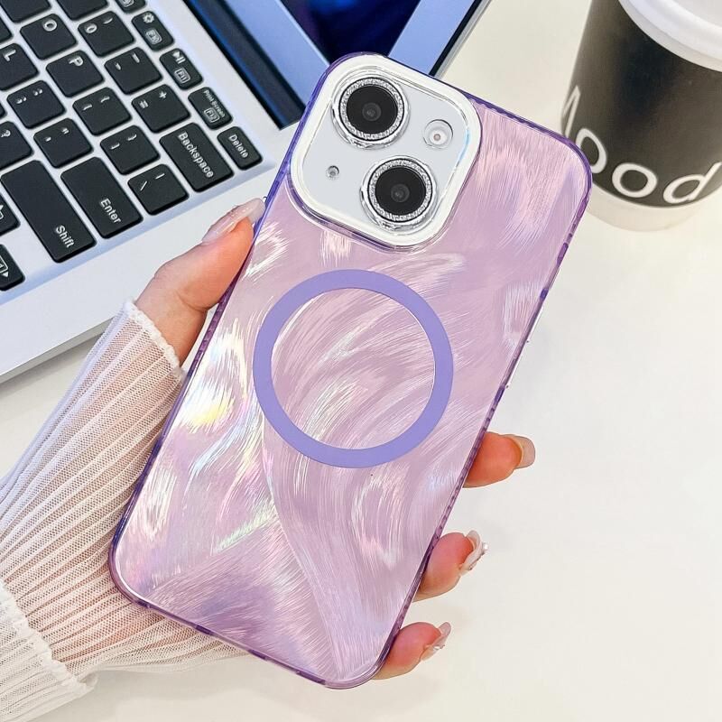 Θήκη τηλεφώνου TPU με επιμετάλλωση, υφή και MagSafe για iPhone 14 με προστατευτική μεμβράνη φακού με γκλίτερ (Μωβ Κύματα Νερού)