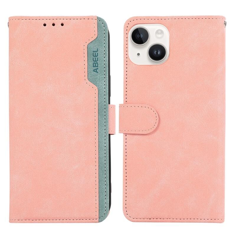 Θήκη τηλεφώνου από δέρμα με μαγνητικό κλείσιμο και προστασία RFID για iPhone 14 Plus ABEEL, σε χρώματα ροζ-κυανό.