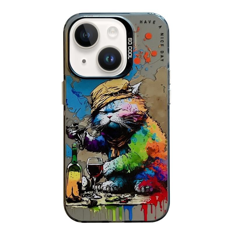 Θήκη κινητού τηλεφώνου για iPhone 14 Plus, σειρά λαδερών ζωγραφιών με σχέδια ζώων (Γάτα που πίνει), PC + TPU.