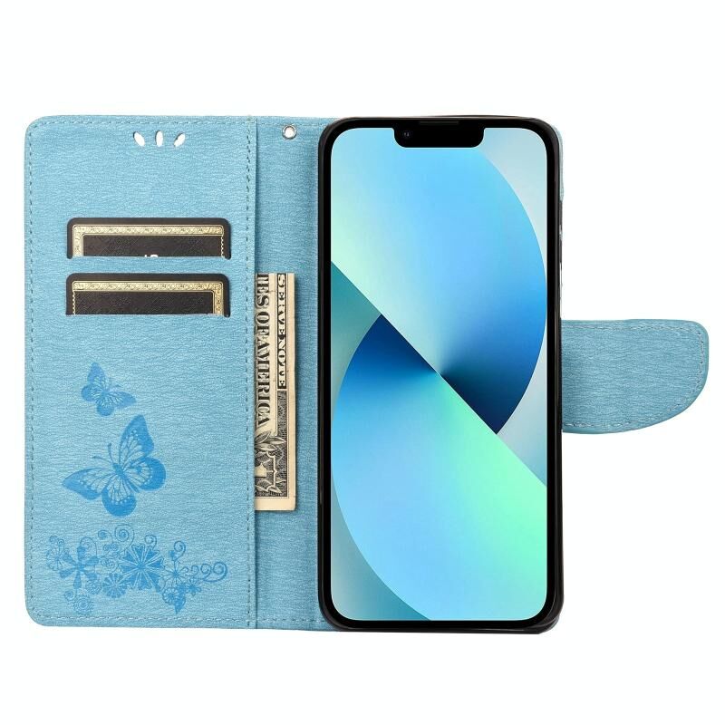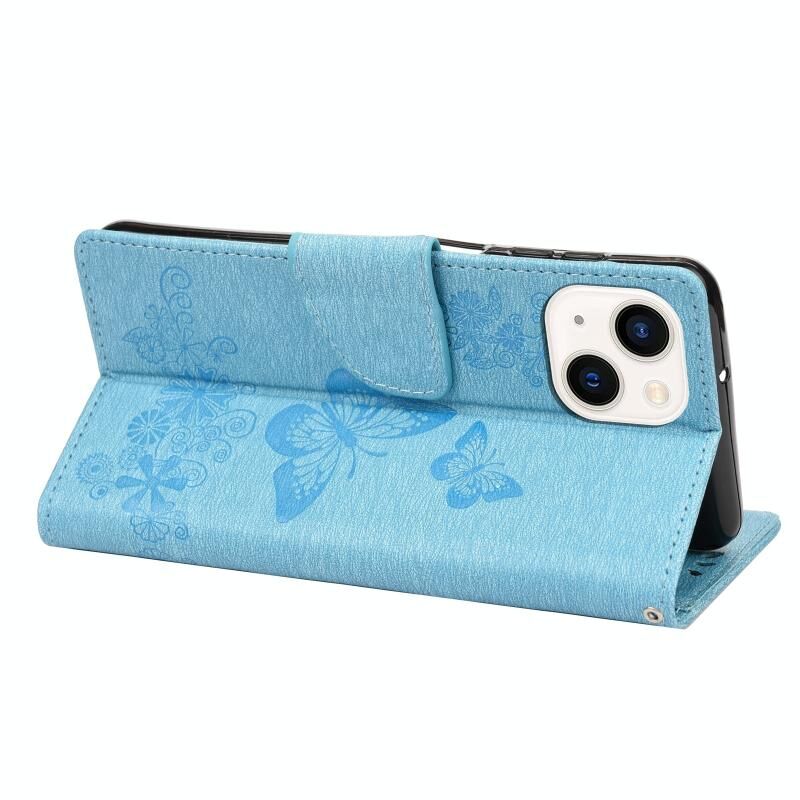 For iPhone 14 Plus Butterfly Embossed Horizontal Flip Leather Phone Case (Blue)