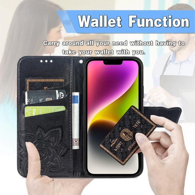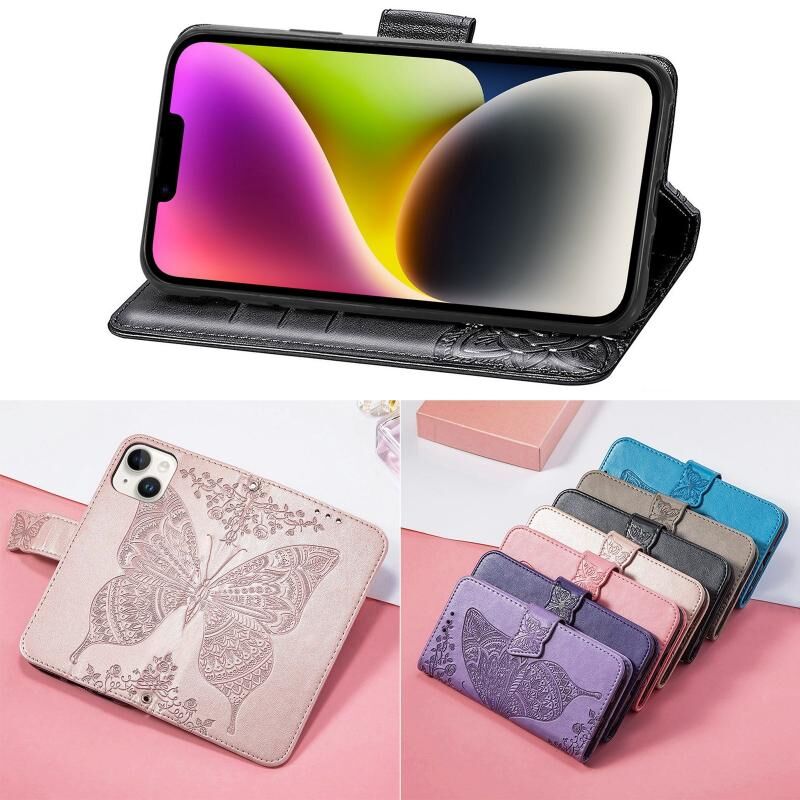 Θήκη δέρματος με ανάγλυφο σχέδιο πεταλούδας για iPhone 14 Plus (Ροζ)