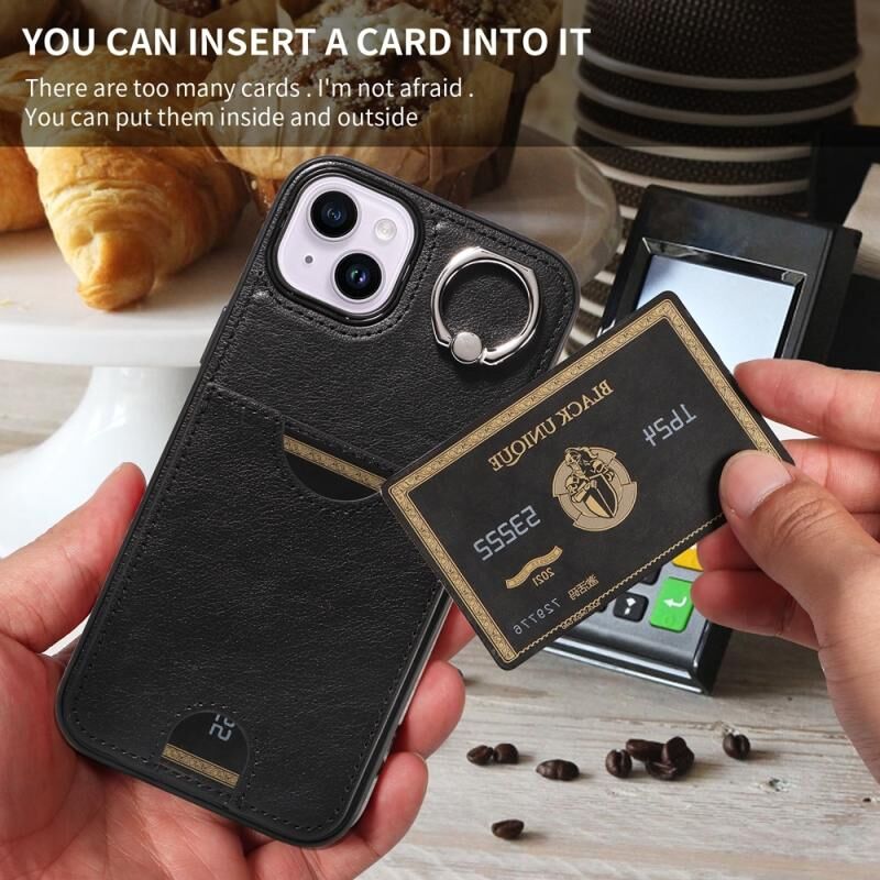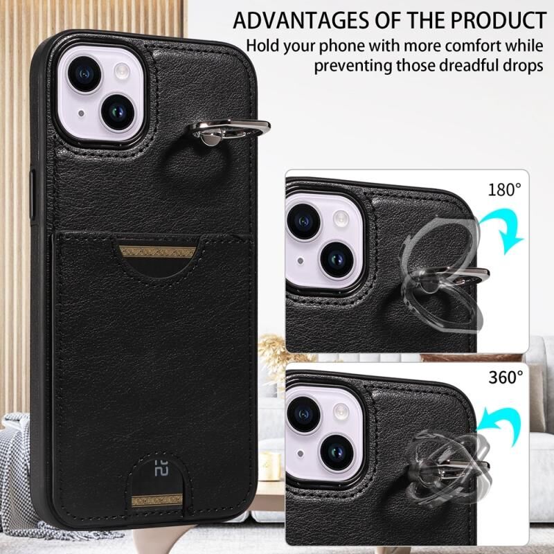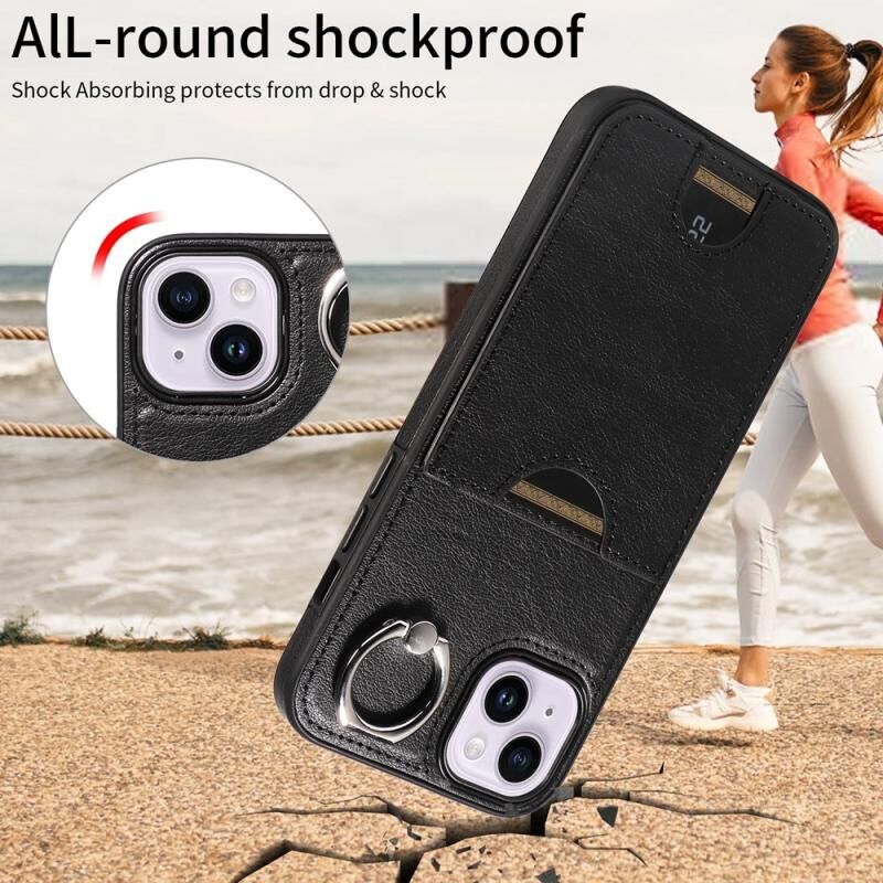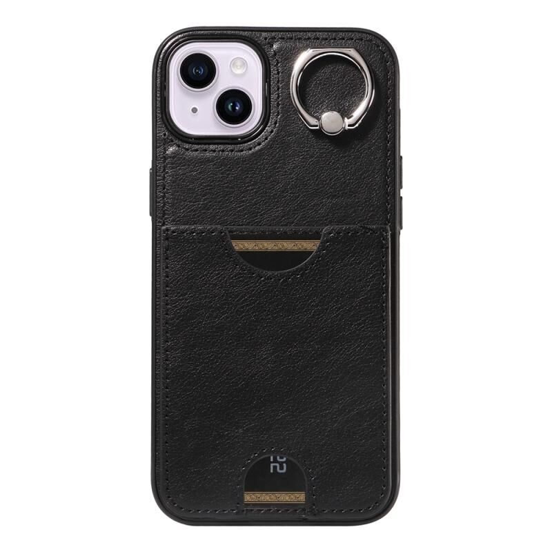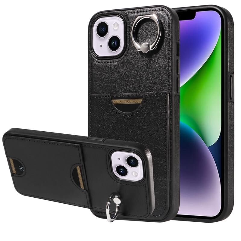 Θήκη τηλεφώνου για iPhone 14 Plus με υφή δέρματος μοσχαριού, θήκη κάρτας και δαχτυλίδι στήριξης (Μαύρο)