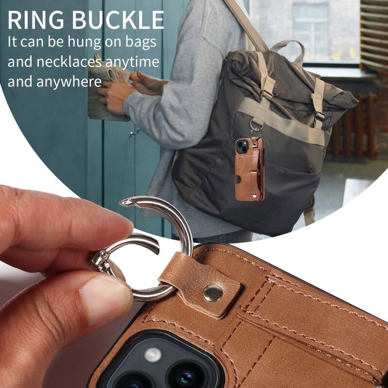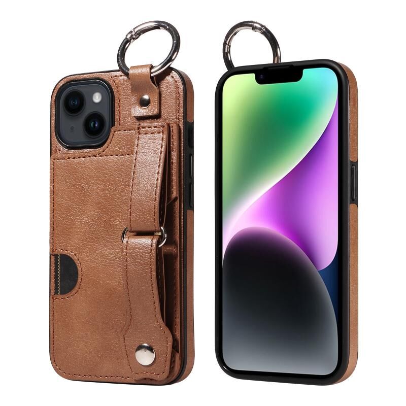 Θήκη τηλεφώνου για iPhone 14 Plus με υφή μοσχαρίσιου δέρματος, θήκη καρπού με υποδοχή κάρτας και δακτύλιο (Καφέ)