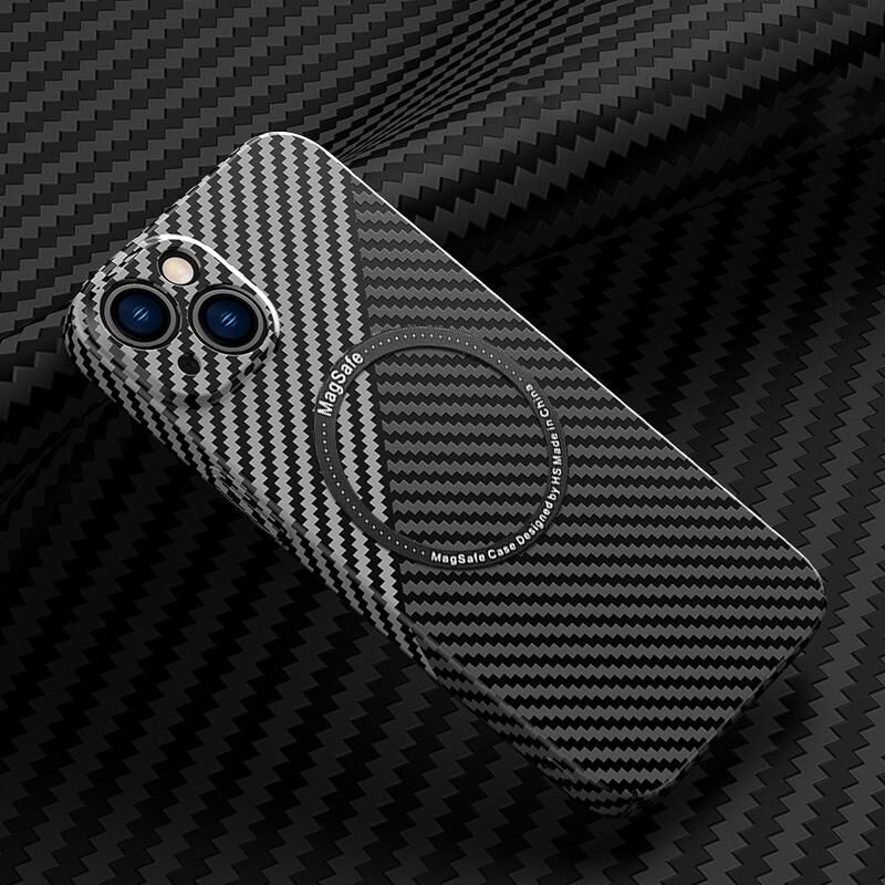 For iPhone 14 Plus Carbon Fiber Texture MagSafe Magnetic Phone Case (Black Silver)