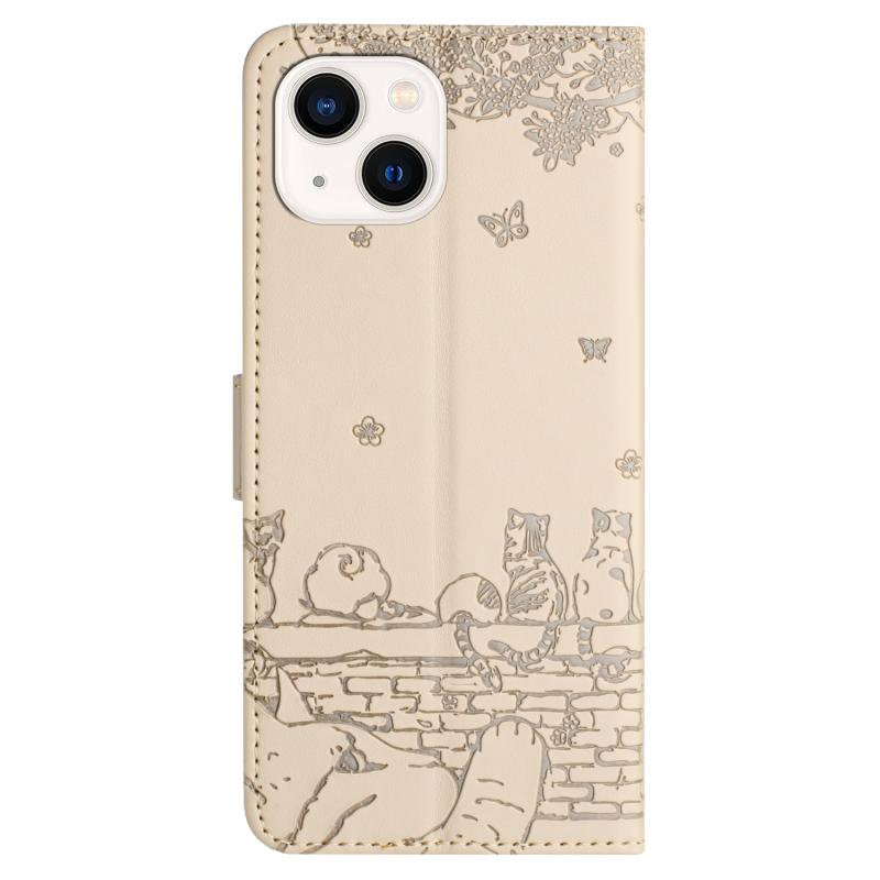 For iPhone 14 Plus Cat Embossing Pattern Leather Phone Case with Lanyard(Beige)