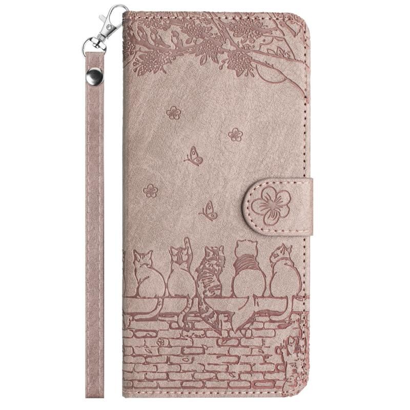 For iPhone 14 Plus Cat Embossing Pattern Leather Phone Case with Lanyard(Grey)