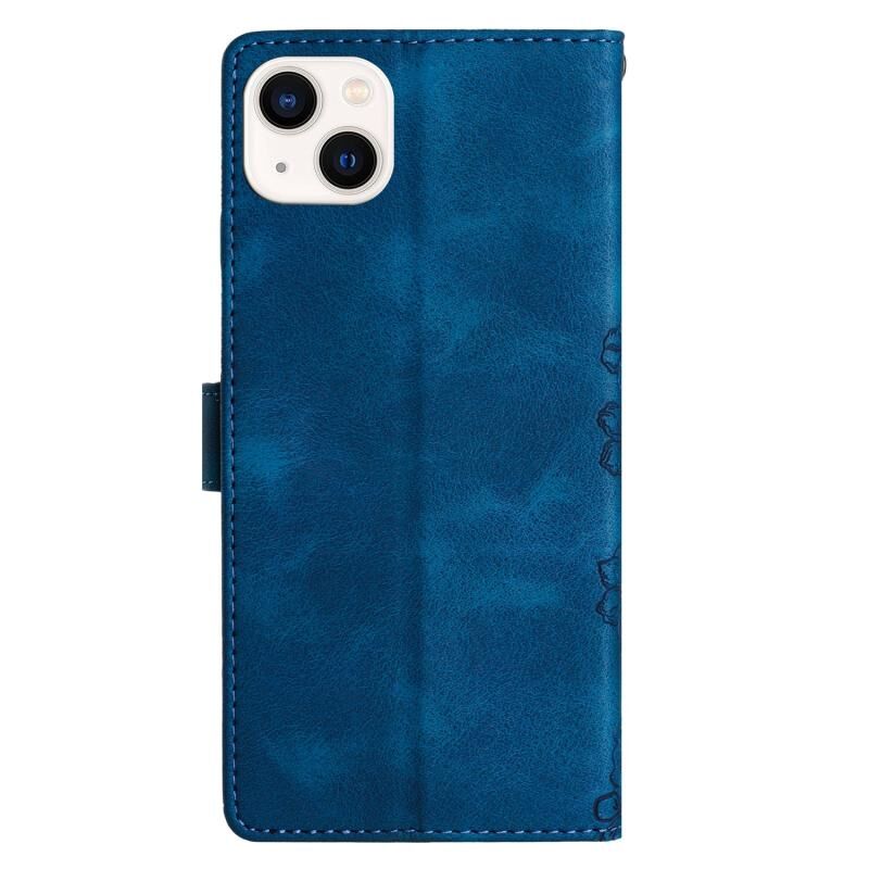 For iPhone 14 Plus Cherry Blossom Butterfly Skin Feel Embossed PU Phone Case(Blue)
