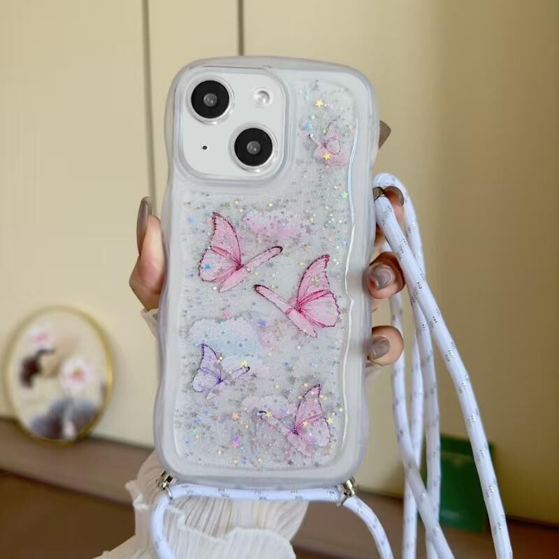 Θήκη κινητού τηλεφώνου TPU για iPhone 14 Plus, τύπου crossbody, με κυματιστά άκρα και σχέδιο πεταλούδας (Ροζ)