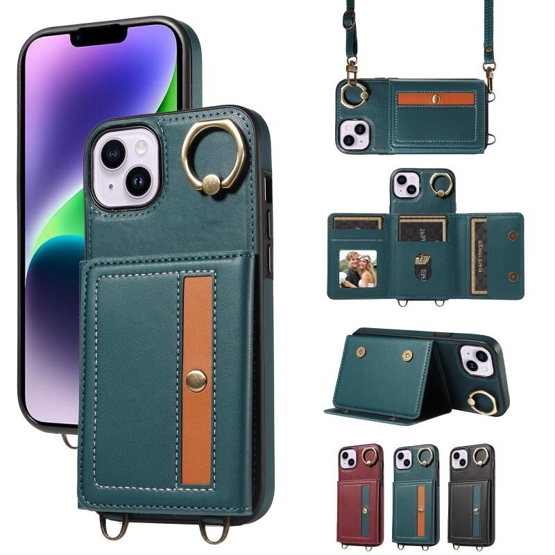 Θήκη τηλεφώνου δερμάτινη για iPhone 14 Plus με θήκη καρτών, λουρί Crossbody και δαχτυλίδι στήριξης (Πράσινο)