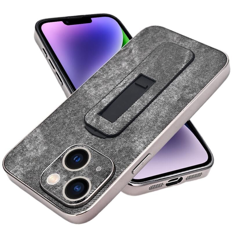For iPhone 14 Plus Denim Pattern Electroplated Push-pull Bracket Cooling Phone Case(Black)