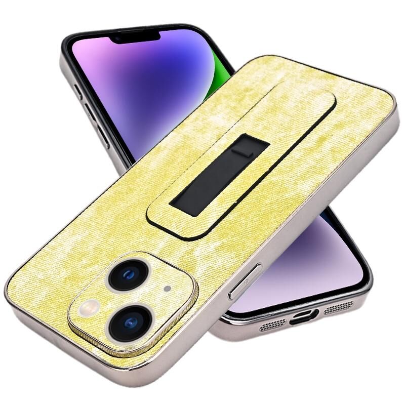 For iPhone 14 Plus Denim Pattern Electroplated Push-pull Bracket Cooling Phone Case(Yellow Green)