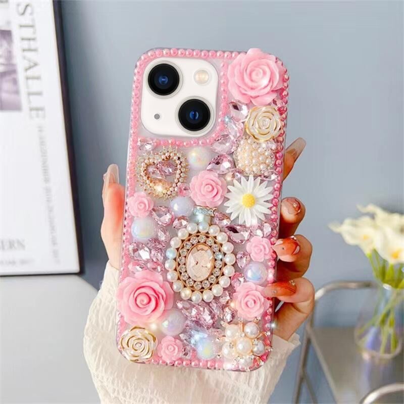 Θήκη τηλεφώνου για iPhone 14 Plus με ενσωματωμένα διαμάντια, από πολυανθρακικό υλικό (PC) σε ροζ χρώμα.
