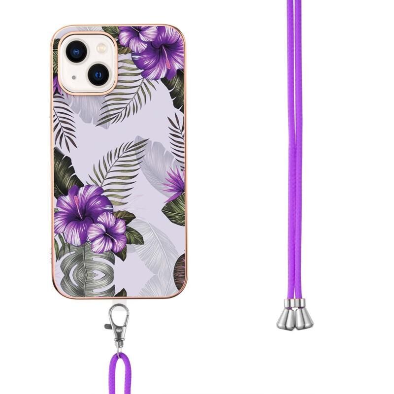Θήκη για iPhone 14 Plus με σχέδιο επιμετάλλωσης IMD TPU αντικραδασμική με λουρί λαιμού (Ροζ Λέπια)