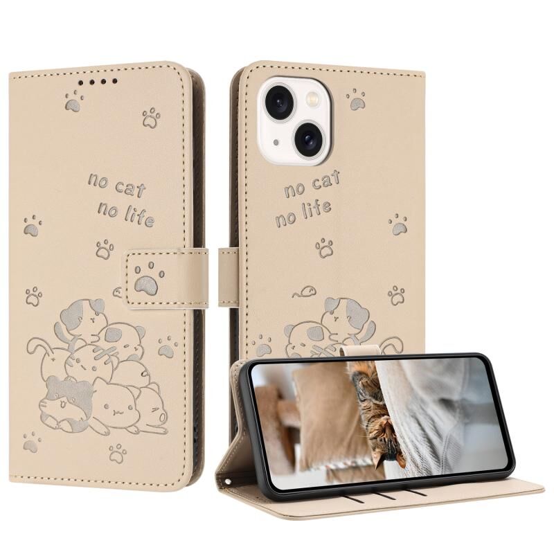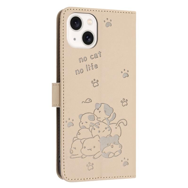 Θήκη δερμάτινη για iPhone 14 Plus με ανάγλυφο γατάκι και κορδόνι (Μπεζ)