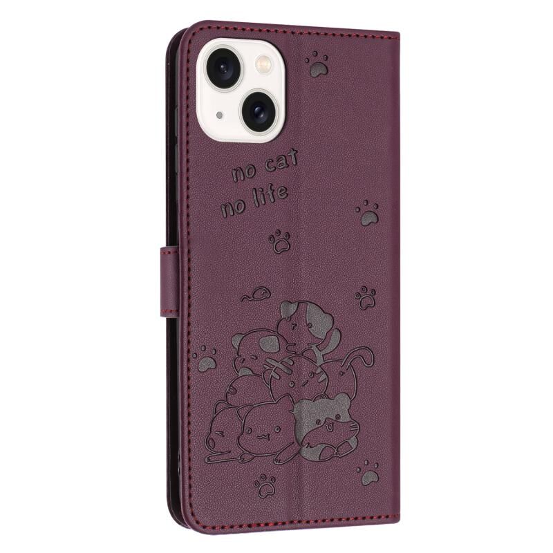 Θήκη δερμάτινη για iPhone 14 Plus με ανάγλυφο γατάκι και κορδόνι (Κόκκινο κρασί)