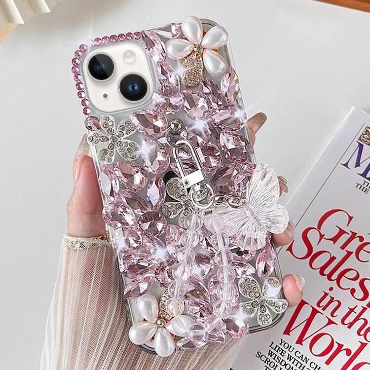 Θήκη τηλεφώνου για iPhone 14 Plus, χειροποίητη με ενθέματα πεταλούδας και διαμάντια, από πολυανθρακικό (PC) (Λευκό)