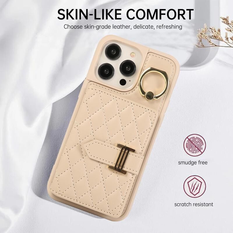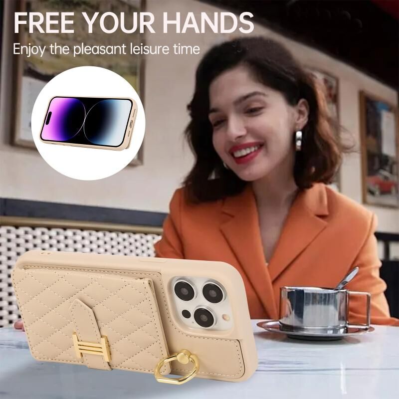 Θήκη τηλεφώνου για iPhone 14 Plus με οριζόντια τσέπη για κάρτες, δακτύλιο στήριξης και διπλό κορδόνι (Μπεζ)