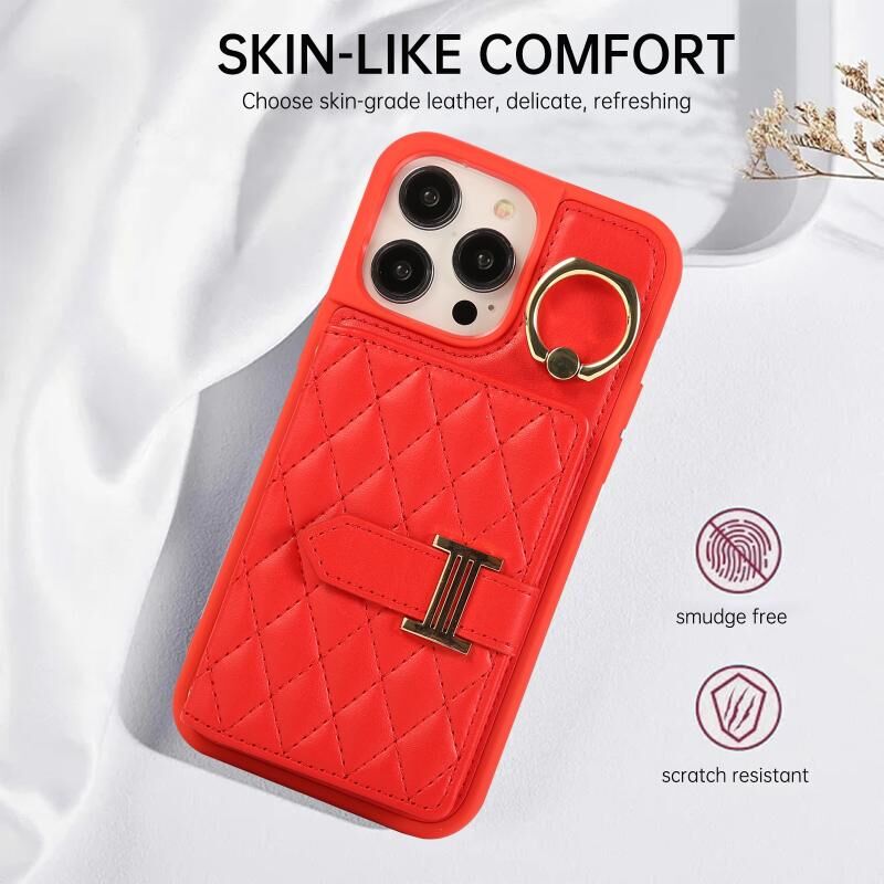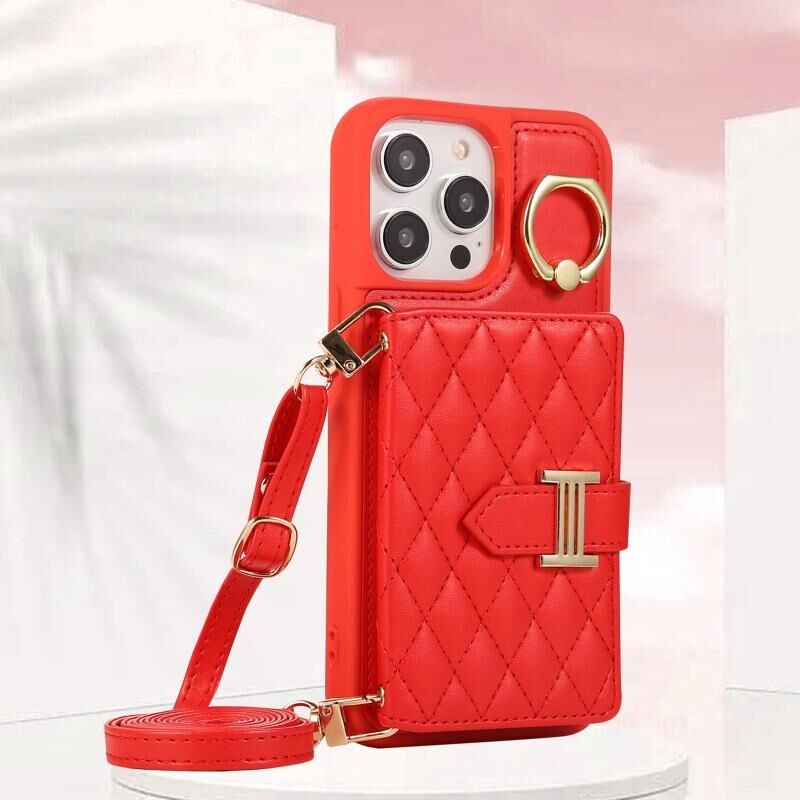 Θήκη τηλεφώνου για iPhone 14 Plus με οριζόντια τσέπη για κάρτες, δακτύλιο στήριξης και διπλό κορδόνι (Σκούρο Μωβ)