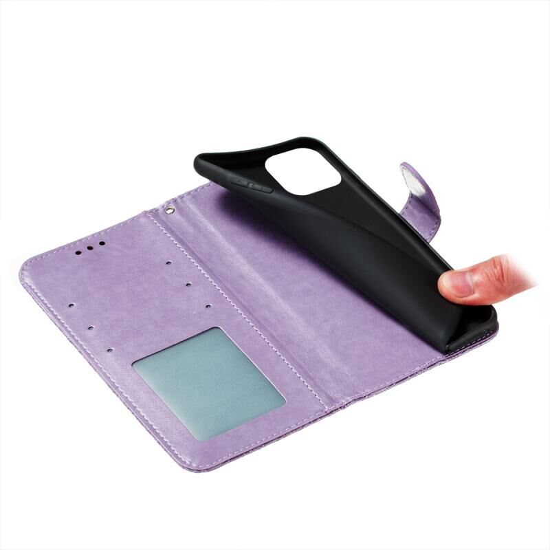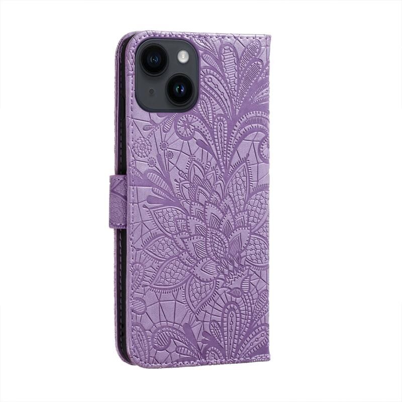 Θήκη τηλεφώνου από δέρμα με ανάγλυφο σχέδιο δαντέλας και λουλουδιών για iPhone 14 Plus (Μωβ)