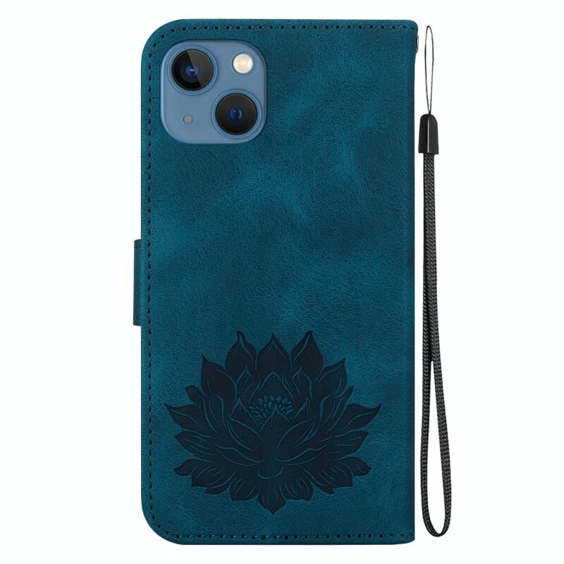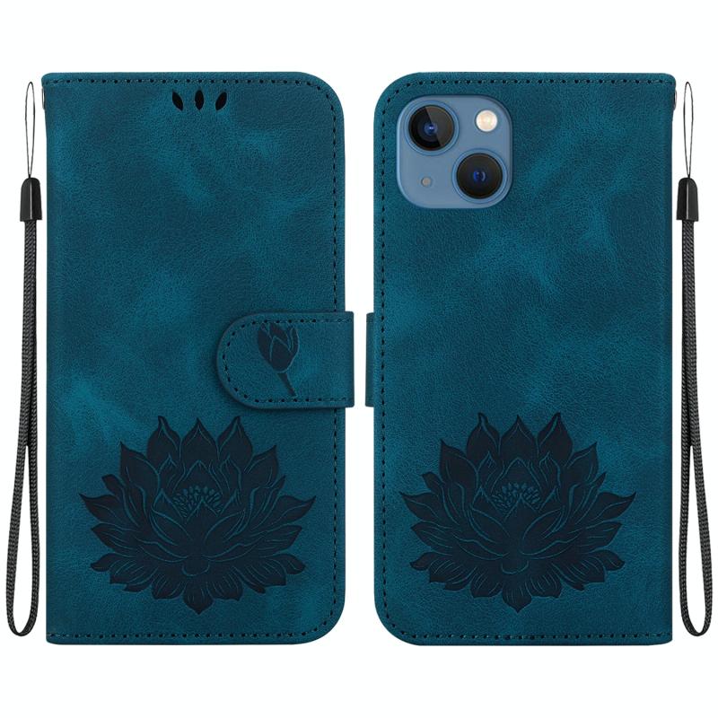For iPhone 14 Plus Lotus Embossed Leather Phone Case(Dark Blue)