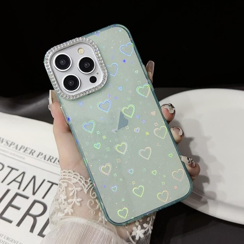 Θήκη τηλεφώνου για iPhone 14 Plus με σχέδιο καρδιάς, διαμαντένια περίμετρο φακού, IMD ακρυλικό (Ροζ)