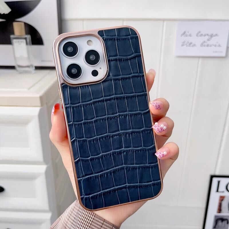 Θήκη τηλεφώνου από γνήσιο δέρμα με νανοεπίχρυση και υφή κροκόδειλου για iPhone 14 Plus (Μπλε)