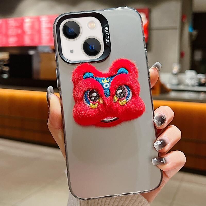 Θήκη τηλεφώνου για iPhone 14 Plus, βελούδινη κούκλα με χορό λιονταριού για την Πρωτοχρονιά (Γκρι πλάτη, κόκκινο λιοντάρι)