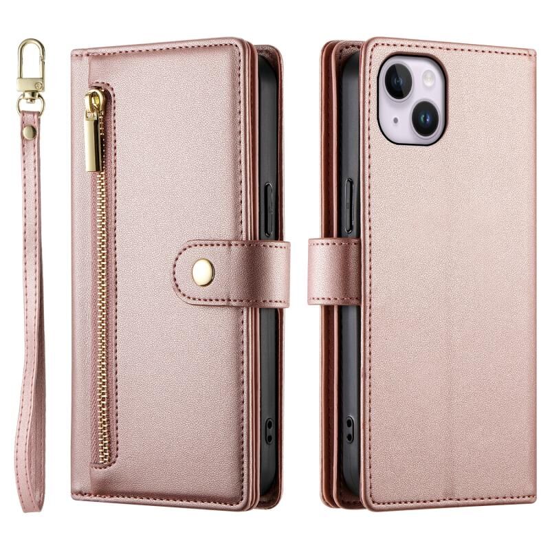 Θήκη τηλεφώνου δερμάτινη με θήκη για κάρτες και φερμουάρ για iPhone 14 Plus (Ροζ)