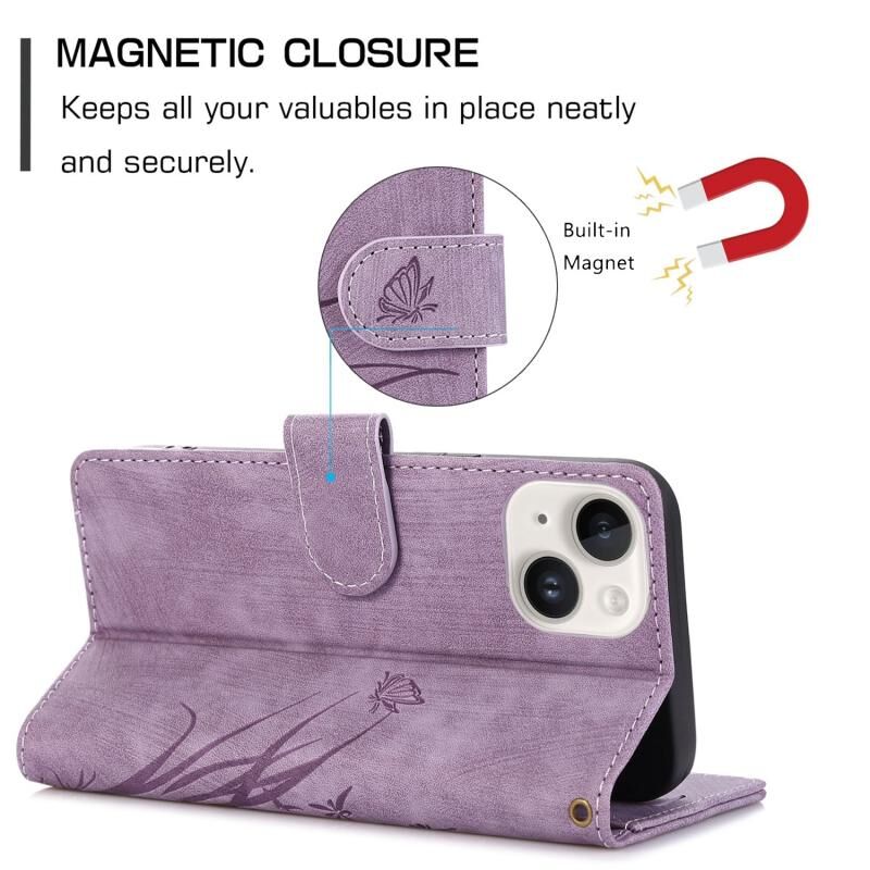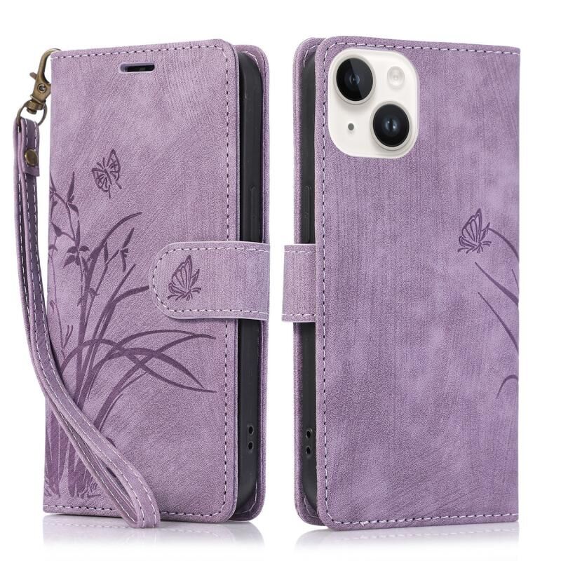 Θήκη τηλεφώνου από δέρμα με ανάγλυφο σχέδιο ορχιδέας και πεταλούδας για iPhone 14 Plus (Μαύρο)