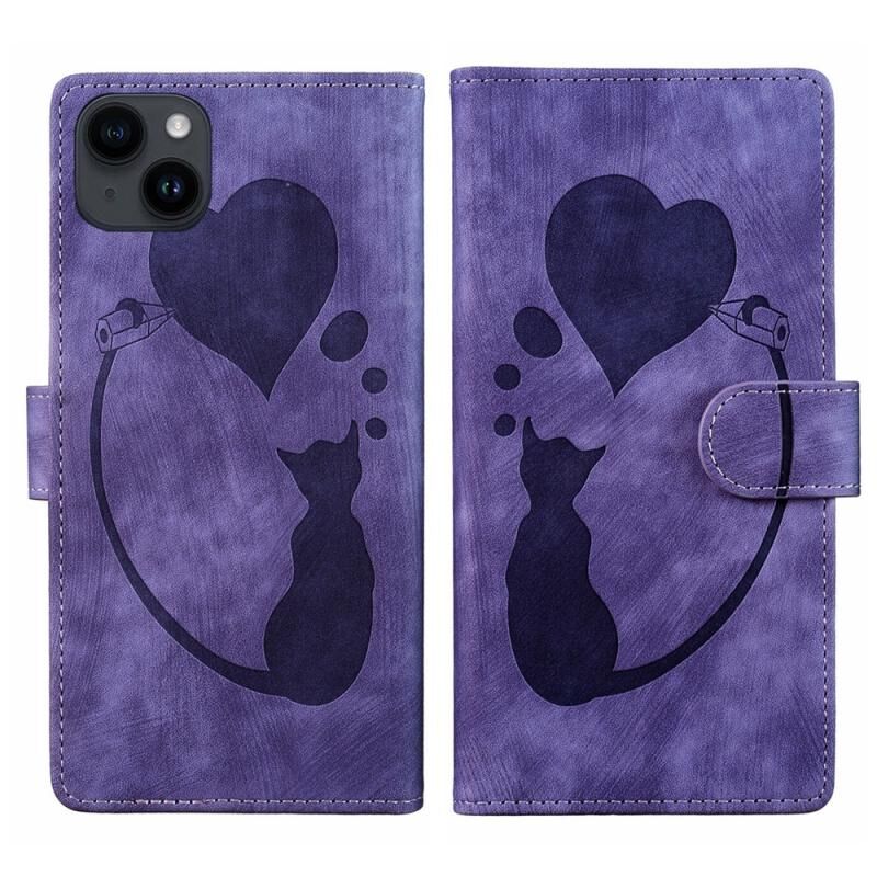 Θήκη τηλεφώνου από δέρμα με ανάγλυφο σχέδιο καρδιάς και γάτας για iPhone 14 Plus (Πορτοκαλί)