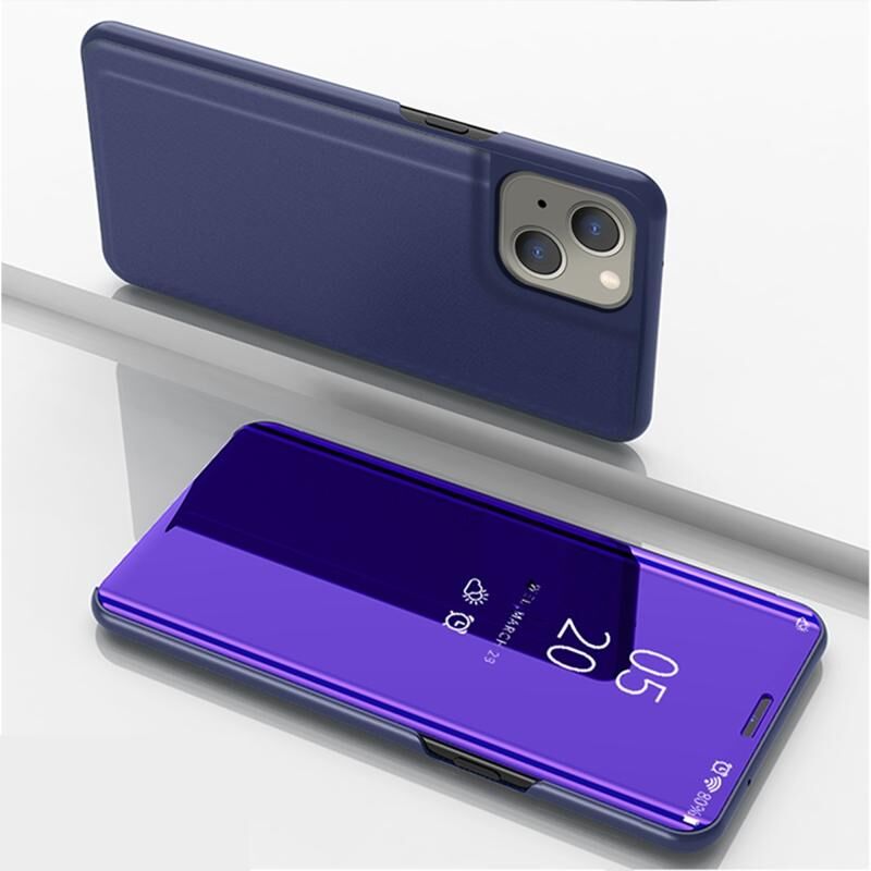 Θήκη τηλεφώνου δερμάτινη οριζόντιας αναδίπλωσης με καθρέφτη για iPhone 14 Plus (Ασημί) με βάση στήριξης.
