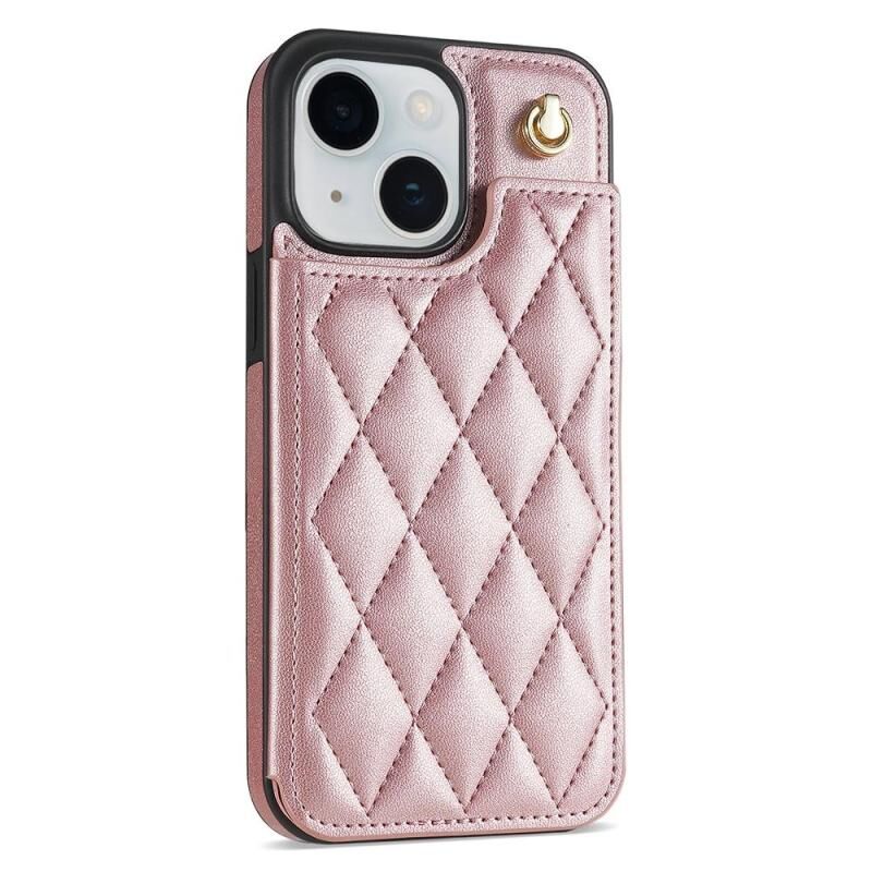 For iPhone 14 Plus Rhombic Dual Buckle Card Slots Phone Case with Lanyard(Rose Gold)