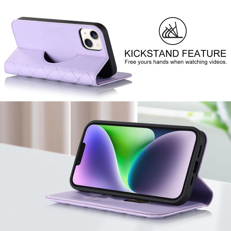 For iPhone 14 Plus Rhombic MagSafe RFID Anti-Theft Wallet Leather Phone Case(Purple)