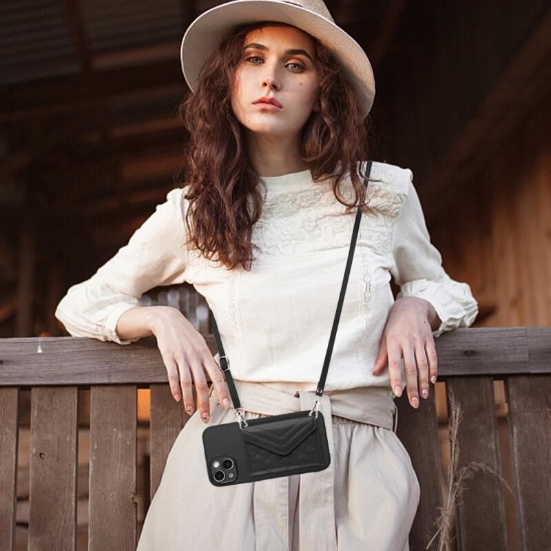 Θήκη κινητού τηλεφώνου RFID με υφή ρόμβου και μακρύ κορδόνι για iPhone 14 Plus (Πράσινο)