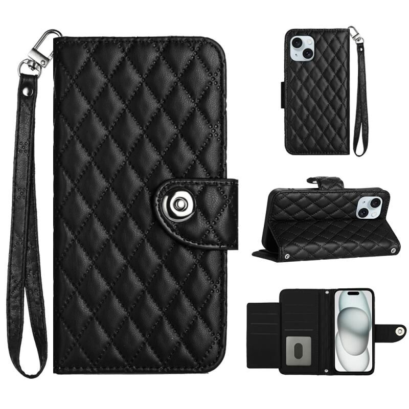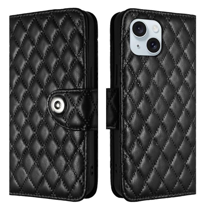 Θήκη τηλεφώνου από δέρμα με ανάγλυφη υφή ρόμβου για iPhone 14 Plus με κορδόνι (Μαύρο)