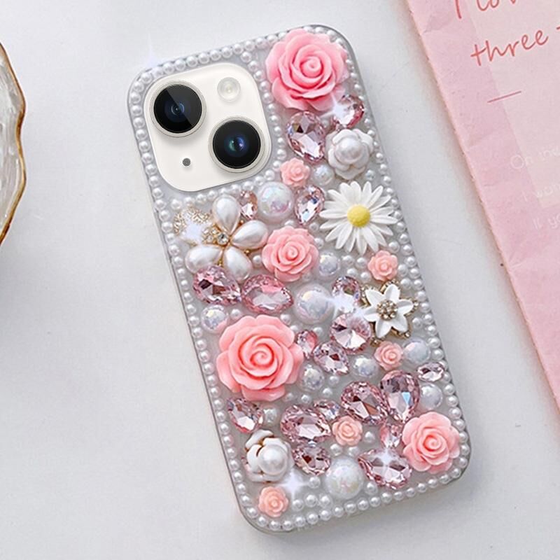 For iPhone 14 Plus Rose Hand-set Diamond PC Phone Case(Pink)