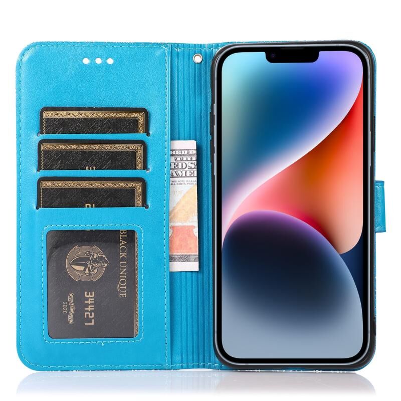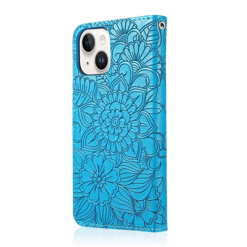 Θήκη δέρματος οριζόντια με ανάγλυφο ηλιοτρόπιο για iPhone 14 Plus (Μωβ) - Αίσθηση δέρματος