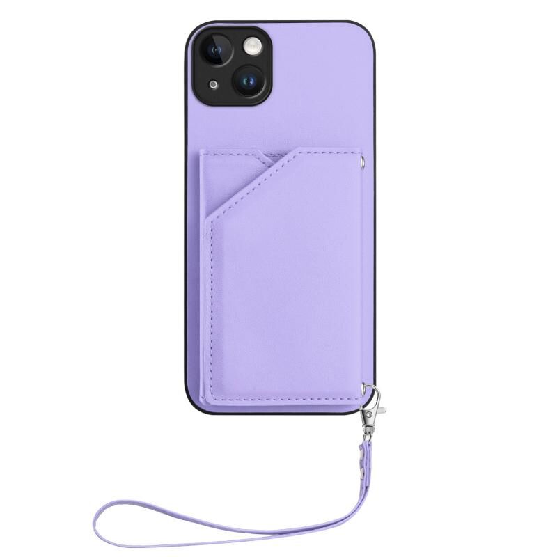 For iPhone 14 Plus Skin Feel Four Card Slots Phone Case with Wrist Strap(Purple)