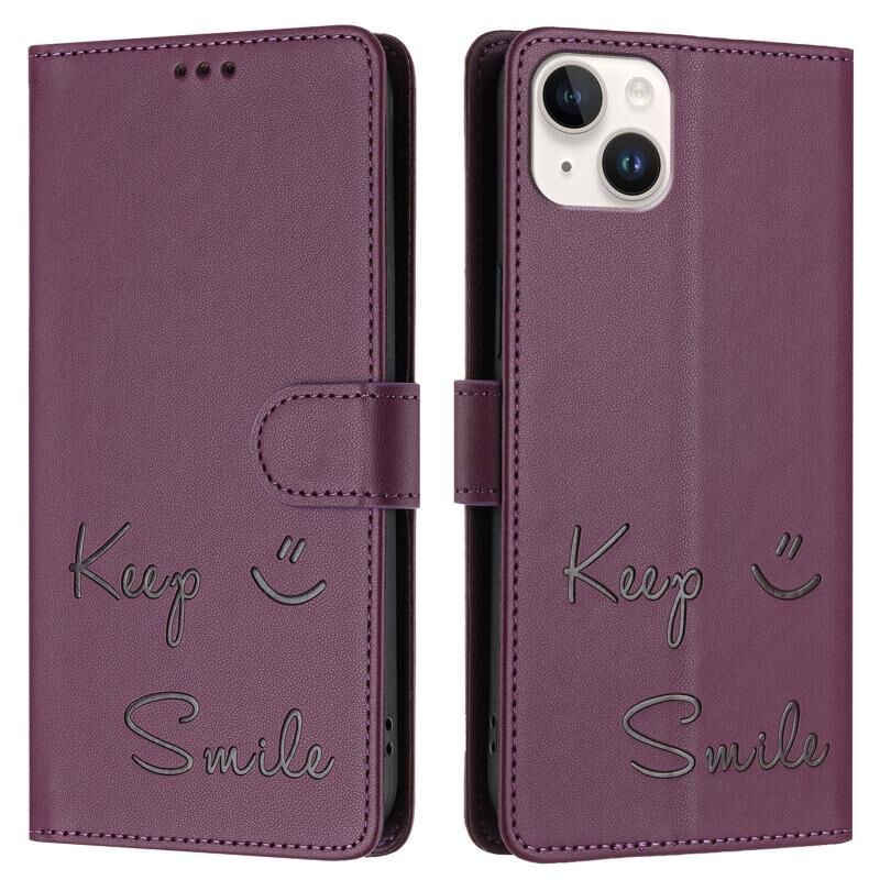 For iPhone 14 Plus Smile Embossing RFID Leather Phone Case(Violet)