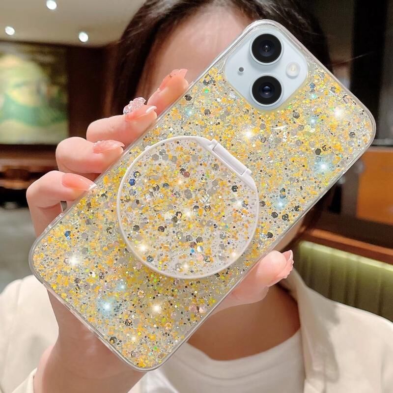 Θήκη τηλεφώνου για iPhone 14 Plus με λαμπερά στρας, στρογγυλό καθρέφτη και βάση από εποξειδική ρητίνη TPU (Κίτρινο)