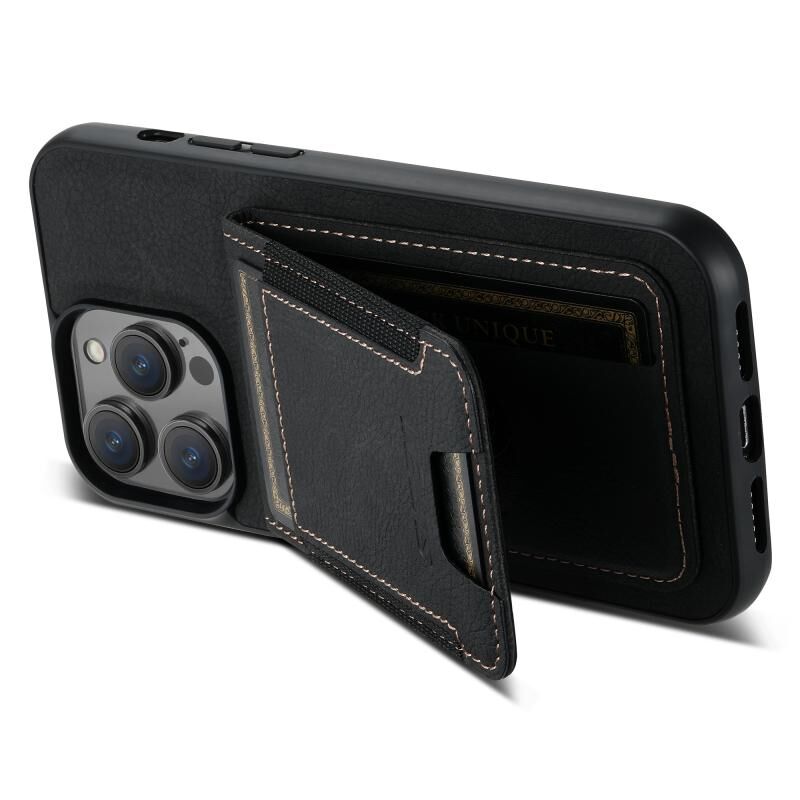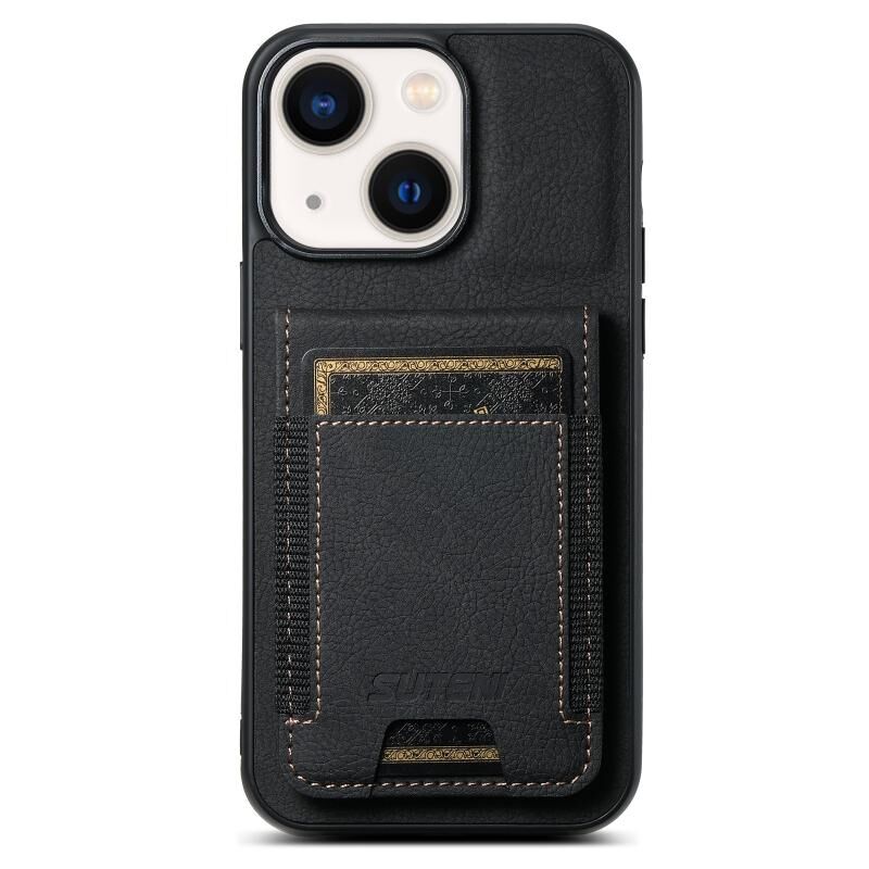 Θήκη κινητού τηλεφώνου Suteni H03 από δέρμα Lychee για iPhone 14 Plus με βάση στήριξης και θήκη καρτών (Μαύρο) (Suteni)