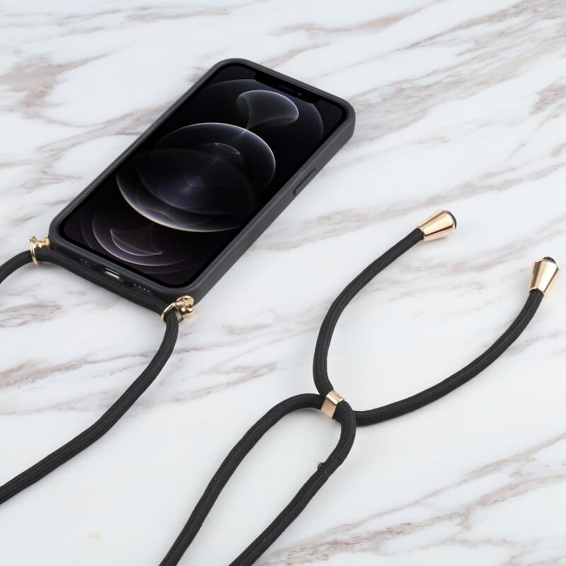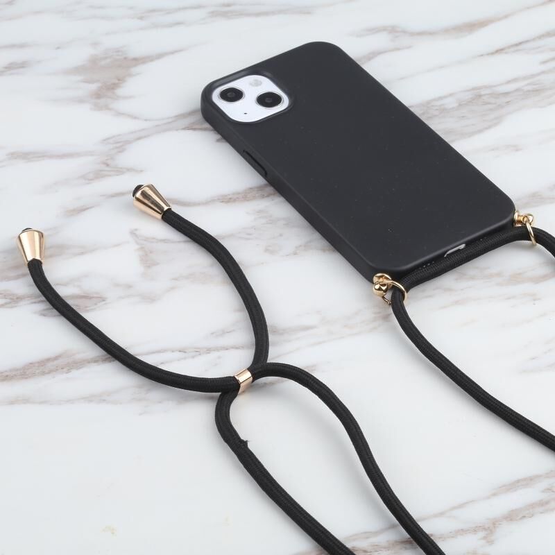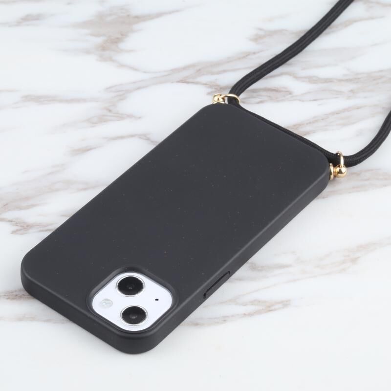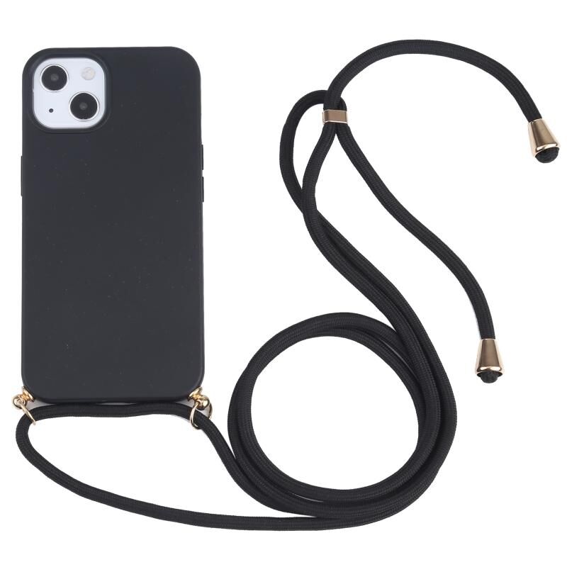 Θήκη τηλεφώνου για iPhone 14 Plus από άχυρο σίτου + TPU αντικραδασμική με κορδόνι λαιμού (Μαύρο)
