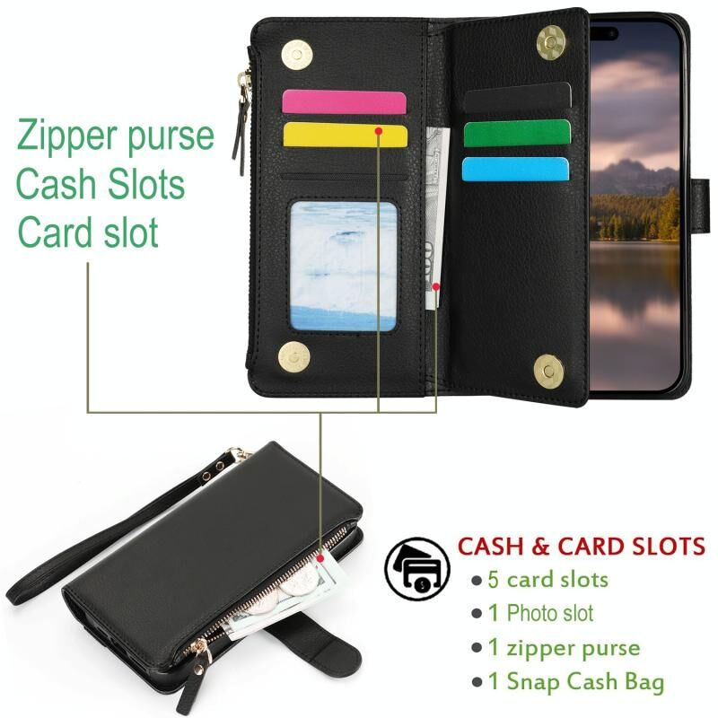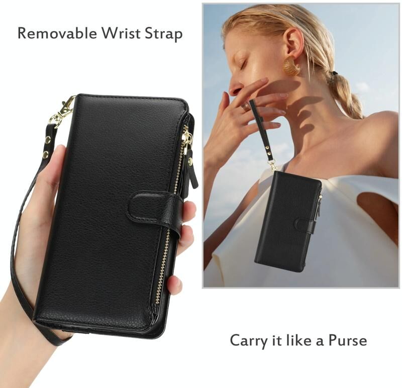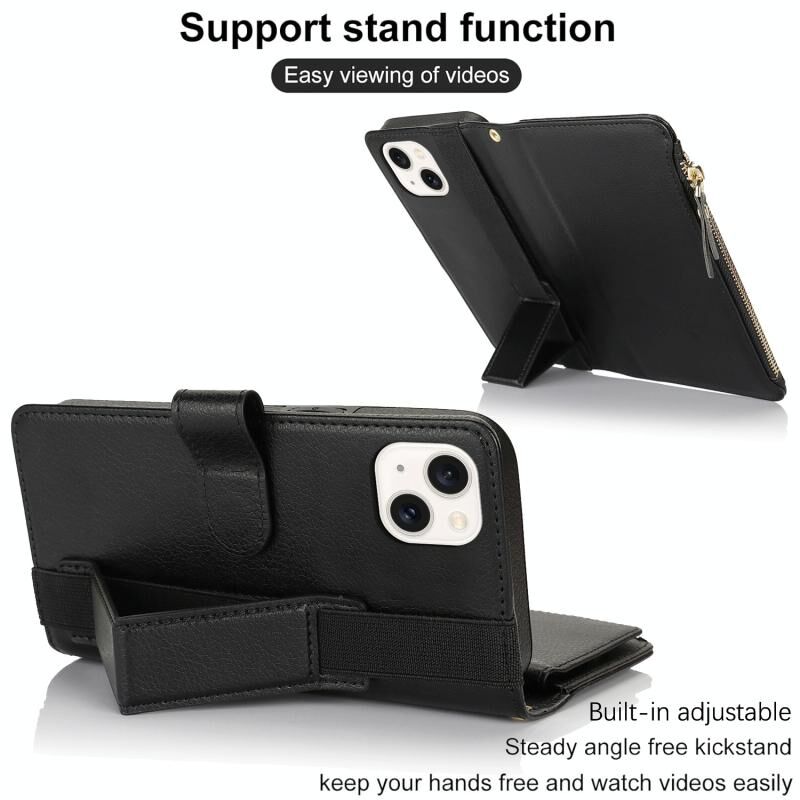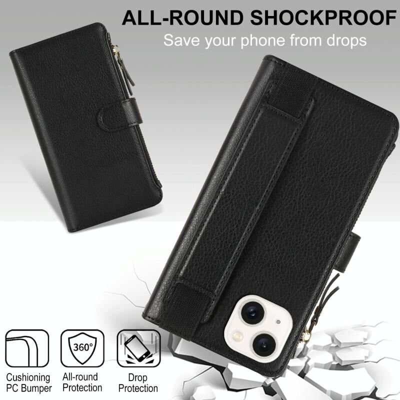 Θήκη για iPhone 14 Plus με Λουρί Χεριού, Πορτοφόλι με Φερμουάρ, Δέρμα με Προστασία RFID (Μαύρο)