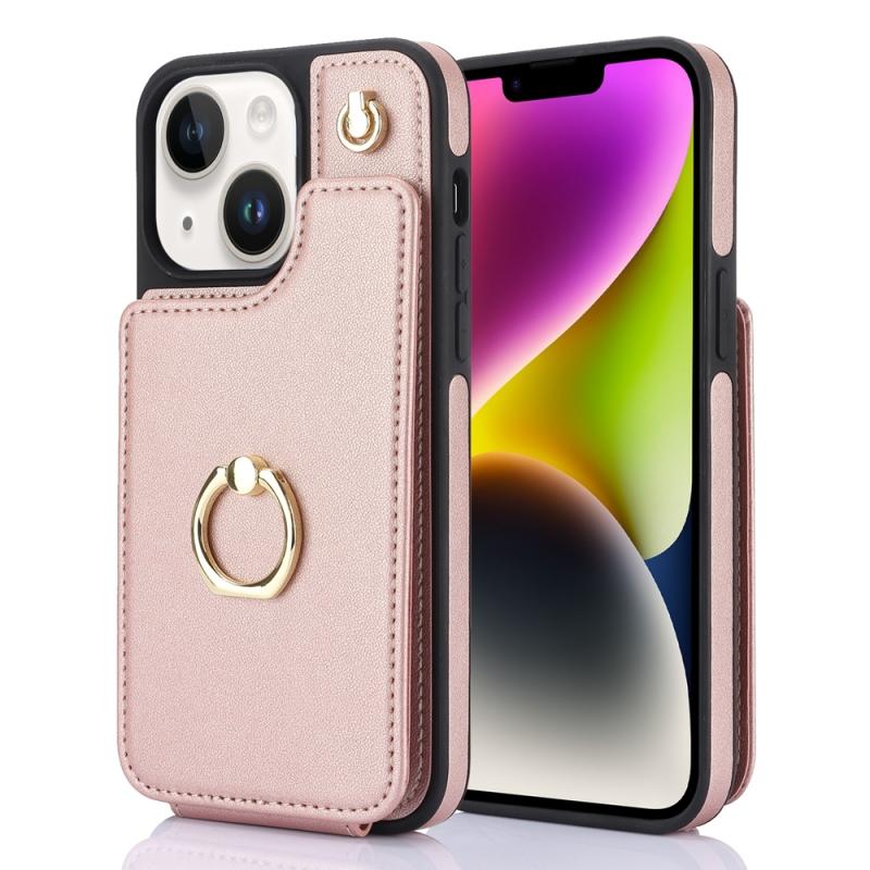 For iPhone 14 Plus YM005 Skin Feel Card Bag Phone Case with Long Lanyard(Rose Gold)
